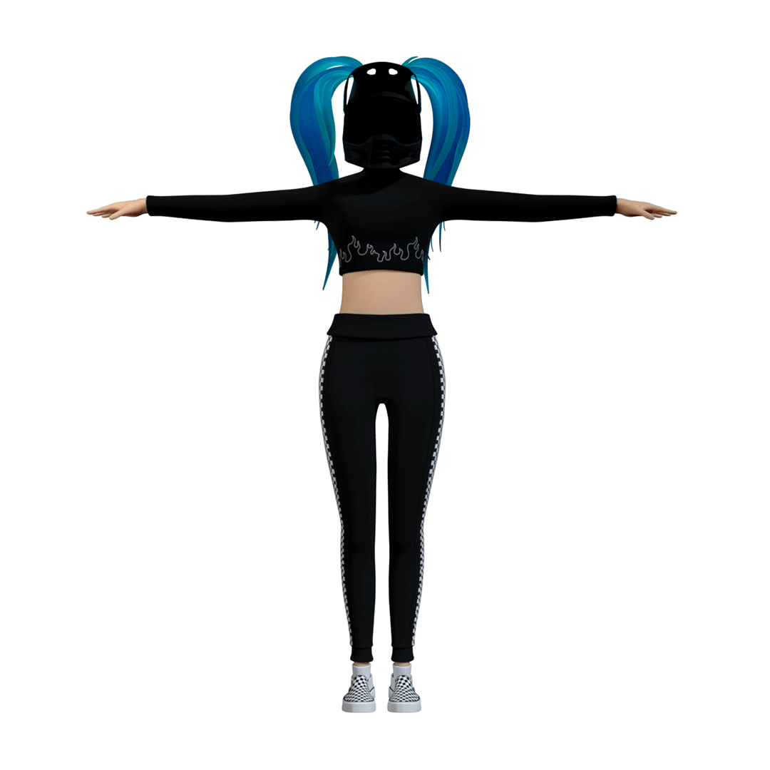 First of all, we decided we wanted to create a realistic female character and next, we wondered what elements would make up her personality. The character is inspired by motorsports, so we thought of a girl wearing a motocross helmet, capturing the checkered flag in some details of her clothes.