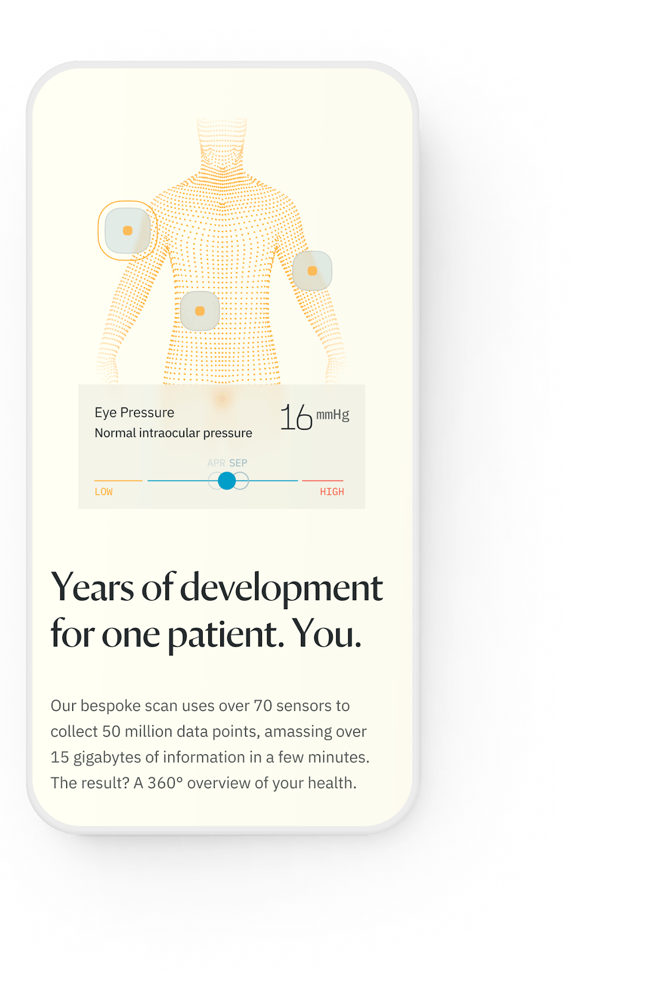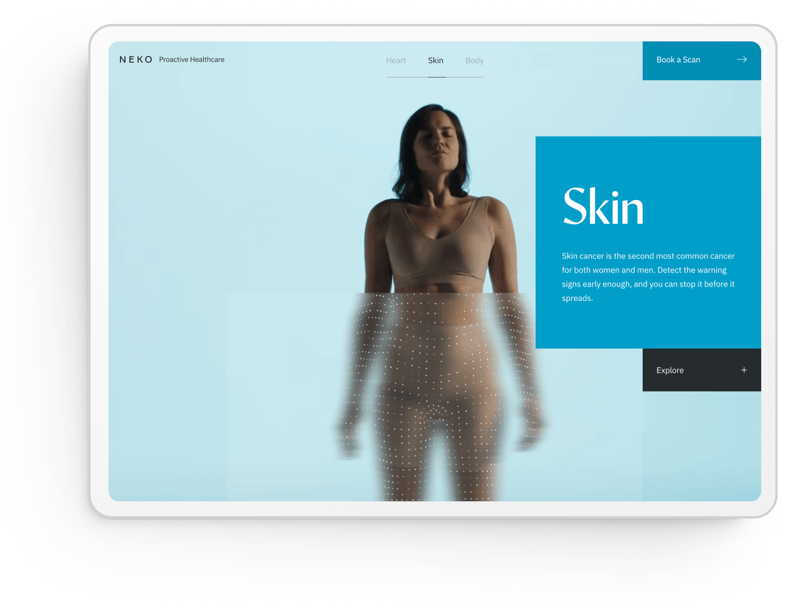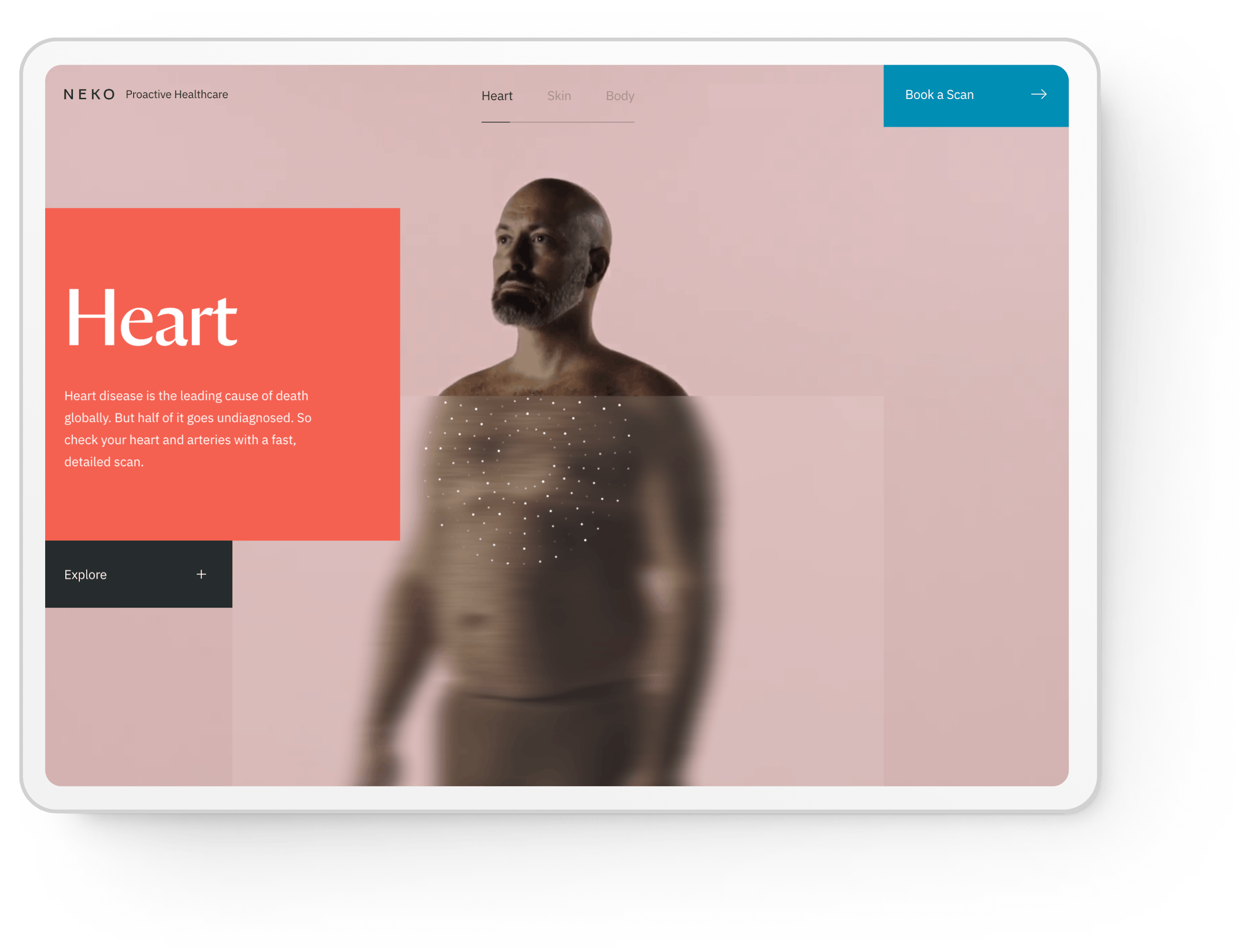 We used motion to uplift the story. Left-to-right movement gives a sense of progression, while blur-to-clear motion conveys clarity for people getting a diagnosis. Interactive points represent Neko's scanning technology.