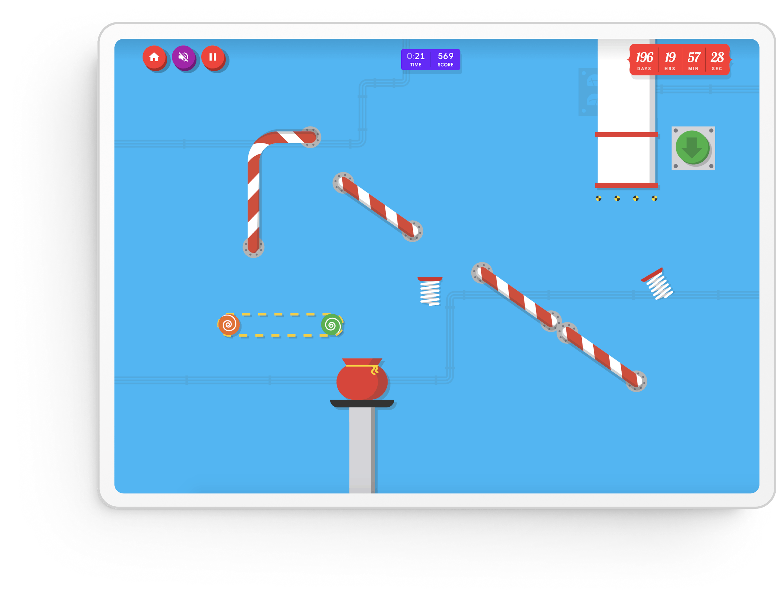 Many of the scenes we created were full-fledged games. In the matching game, kids play against the clock to beat Santa on his own playing field. We built multiple levels and scorekeeping into the logic for these games.