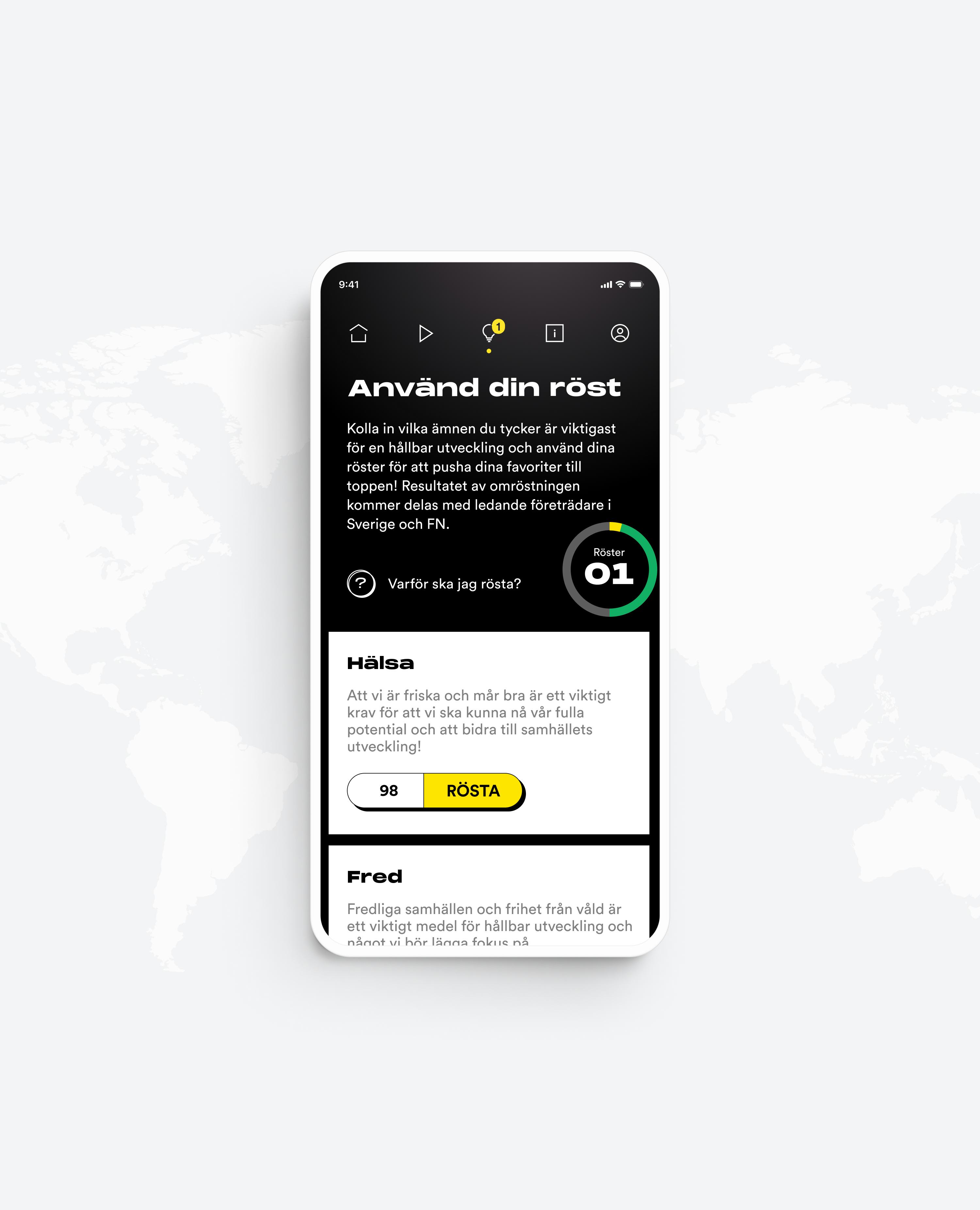 We built the whole experience to motivate and reward learnings. Promoting knowledge for a better world, users get votes for every fact they learn. Collected votes can be used to share opinions with leading Sweden and United Nations representatives.